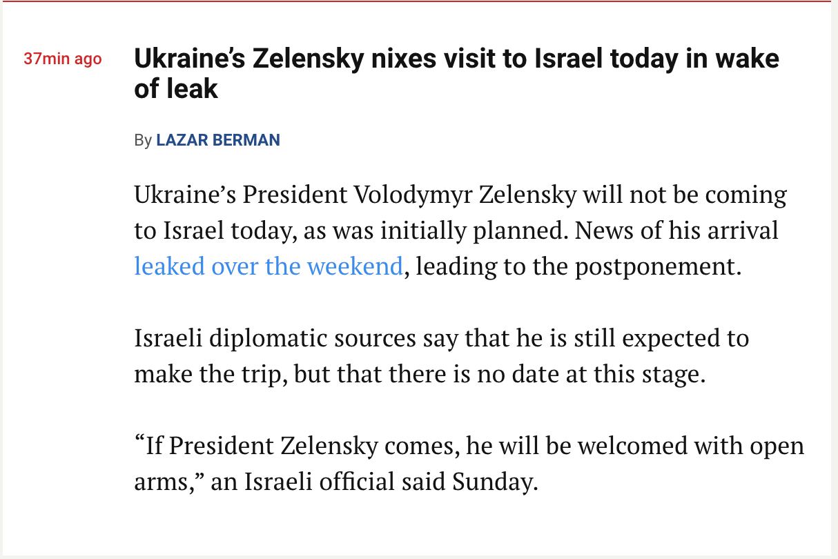 Затем появились публикации прессы, согласно которым в начале октября президент Зеленский хотел приехать в Израиль одновременно с государственным секретарем США Энтони Блинкеном, но израильские власти ему ответили, что сейчас для этого "неподходящее время". СМИ писали, что визит может состояться позже.