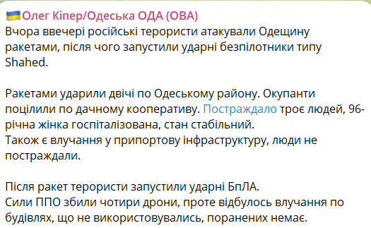 "Ракетами ударили дважды в Одесский район. Оккупанты попали по дачному кооперативу. Пострадали три человека, 96-летняя женщина госпитализирована, состояние стабильное. Также есть попадание в припортовую инфраструктуру, люди не пострадали", - написал он.