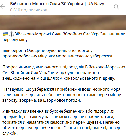 "Профессиональными действиями одного из подразделений ВМС Вооруженных сил Украины мина была оперативно обезврежена на месте путем контролируемого подрыва", - говорится в сообщении.