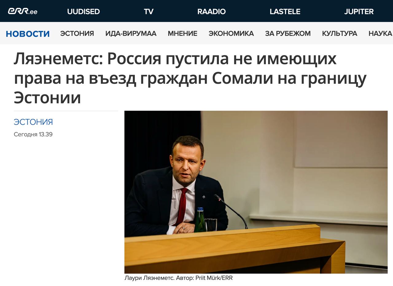 Глава МВД Эстонии Лаури Ляэнеметс сообщил, что сегодня утром в Эстонию через Нарву пытались въехать 8 граждан Сомали, не имеющие права на въезд.