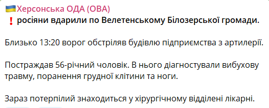 Сегодня днем российские военные нанесли удары из артиллерии по предприятию в поселке Велетенское Белозерской громады. Ранен человек.