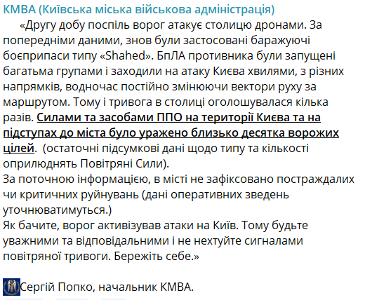 "Вторые сутки подряд враг атакует столицу дронами. По предварительным данным, снова были применены баражирующие боеприпасы типа "Shahed". БПЛА противника были запущены многими группами и заходили на атаку Киева волнами по разным направлениям, одновременно постоянно меняя векторы движения по маршруту. Потому и тревога в столице объявлялась несколько раз. Силами и средствами ПВО на территории Киева и на подступах к городу было поражено около десятка враждебных целей", - сообщил глава КГВА Сергей Попко.