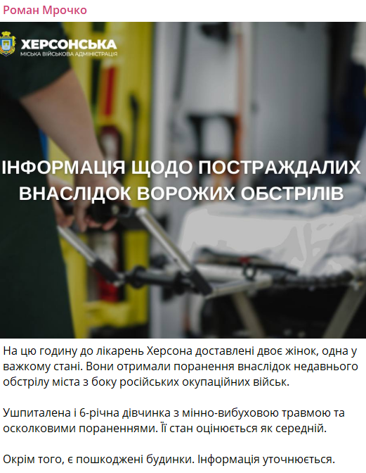 15:24 По уточненной информации, в херсонских больницах находятся трое взрослых и один ребенок, получивший ранения сегодня в результате российского обстрела. Об этом руководитель МВА Роман Мрочко.