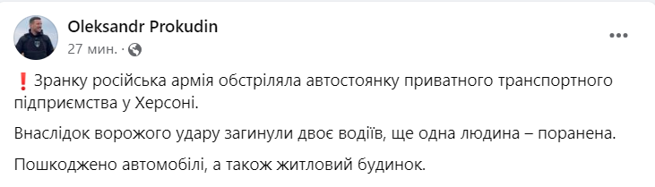 Сегодня утром армия РФ обстреляла автостоянку частного транспортного предприятия в Херсоне, погибли два человека.