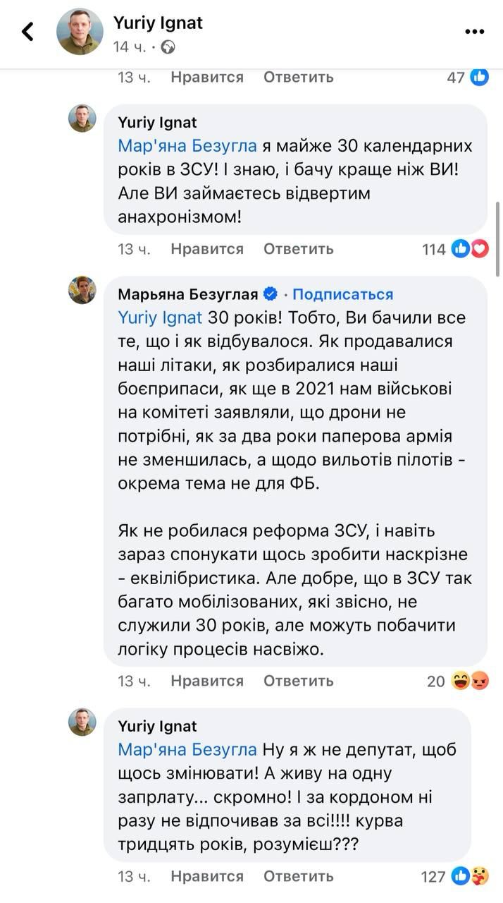 Безуглая пришла к нему в комментарии и обвинила спикера Воздушных сил в том, что он получил команду сверху.