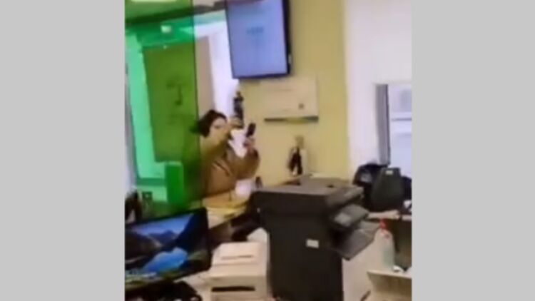 Женщина выплеснула зеленку на сотрудников банка. Скриншот видео