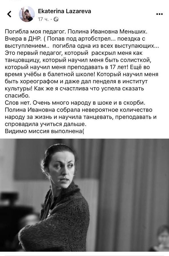 В Старобешево (захваченная россиянами часть Донецкой области, 40 километров от линии фронта) в результате прилета погибла российская актриса Полина Меньших, пишут российские паблики.