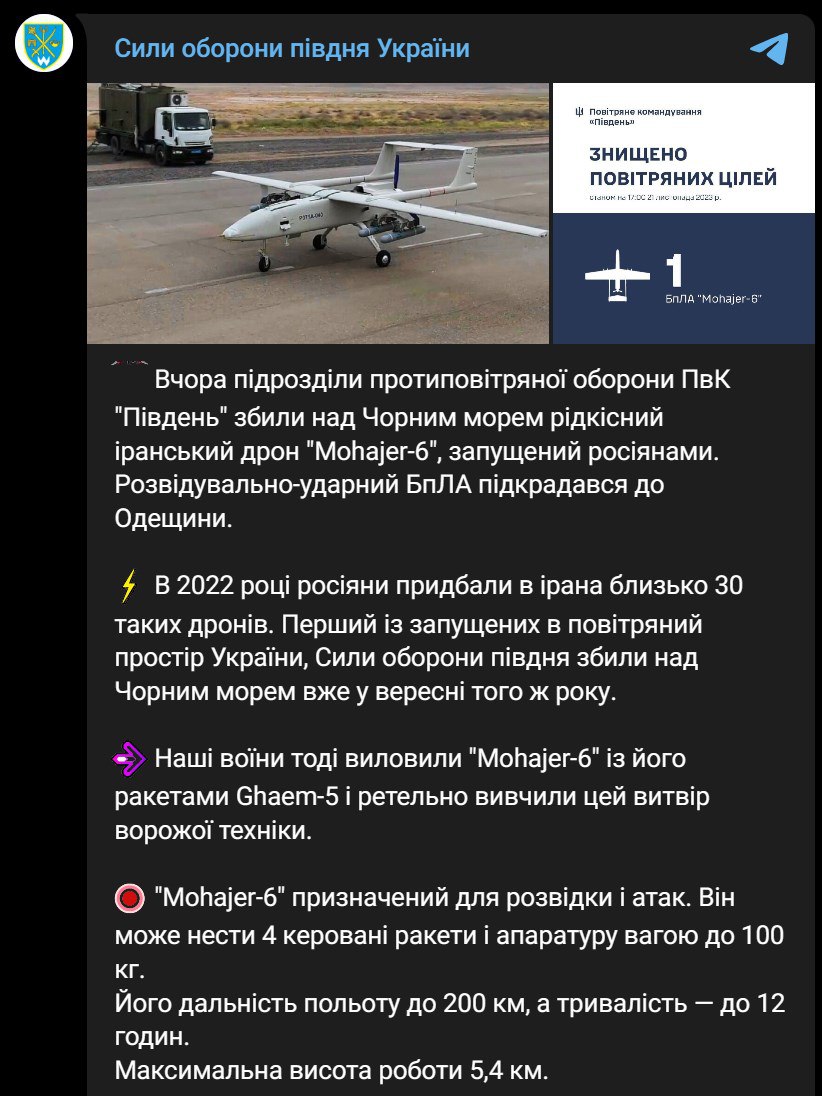 08.55 Вчера ВСУ второй раз за время войны сбили иранский дрон Mohajer-6. Его приземлили на подлете к Одесской области.