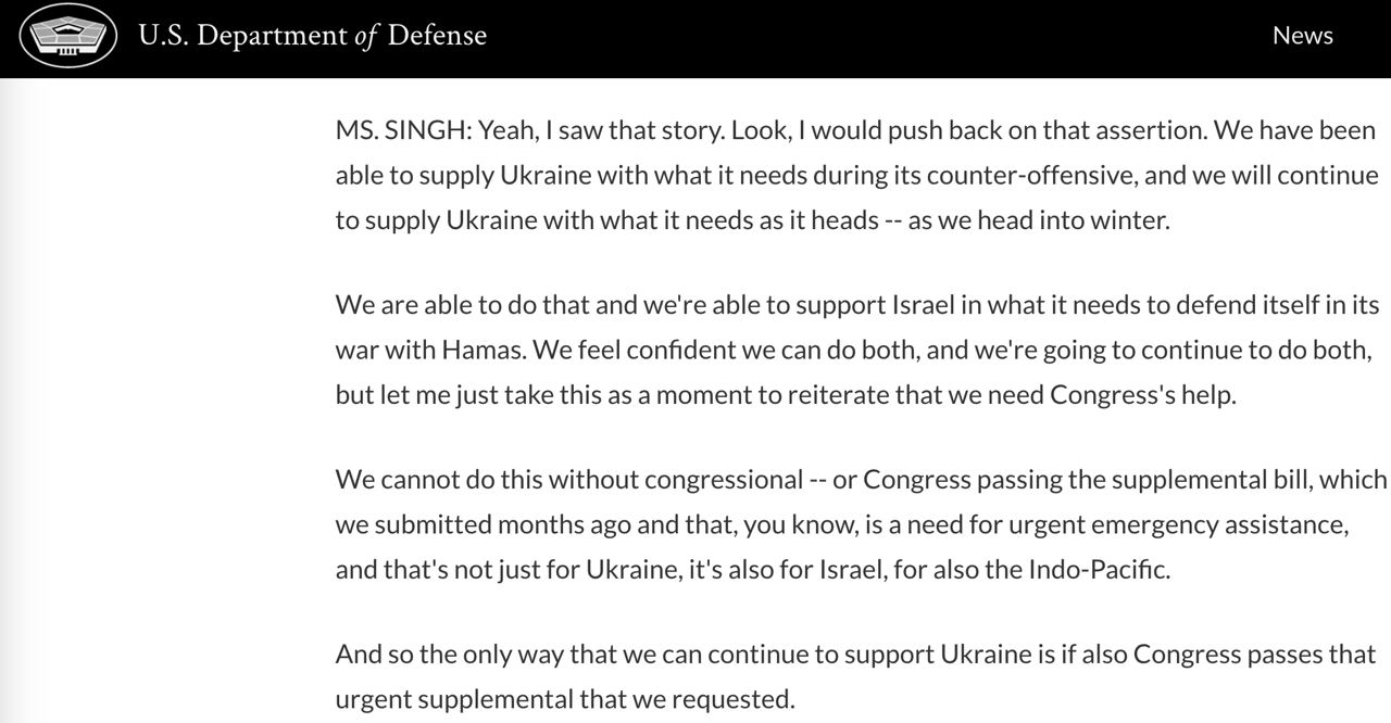 "Да, я видела эту историю. Послушайте, я бы так не заявляла. Мы смогли снабдить Украину тем, что ей нужно во время ее контрнаступления, и мы продолжим снабжать Украину тем, что ей нужно, пока она приближается к зиме", - заявила пресс-секретарь Минобороны США Сабрина Сингх на брифинге.