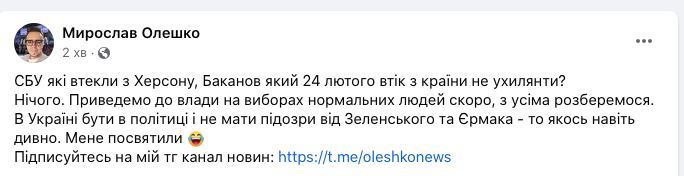"СБУ, которая сбежала из Херсона, Баканов, который 24 февраля сбежал из страны, не уклонисты? Ничего. Приведем к власти на выборах нормальных людей скоро, со всеми разберемся. В Украине быть в политике и не иметь подозрения от Зеленского и Ермака - это как-то даже странно. Меня посвятили", - написал Олешко.