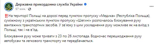 "На дороге перед пунктом пропуска "Медика" (Польша), смежном с украинским пунктом пропуска "Шегини", началось блокирование движения грузовых транспортных средств. В этой связи усложнение движения возможно как на выезд из Польши, так и на въезд.