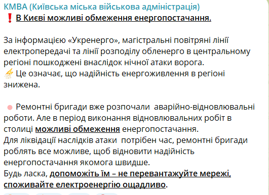 10:31 В Киеве после ночной атаки БПЛА возможны отключения света, предупредила городская военная администрация.