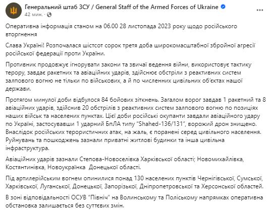 Во вторник, 28 ноября, Генштаб ВСУ обнародовал сводку о ситуации на фронте