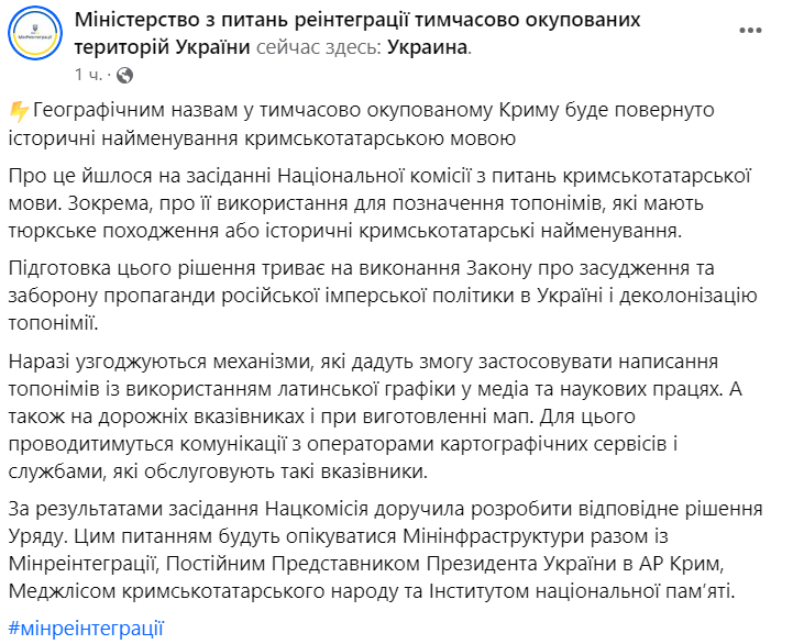 "Географическим названиям во временно оккупированном Крыму будут возвращены исторические наименования на крымскотатарском языке", - говорится в сообщении.
