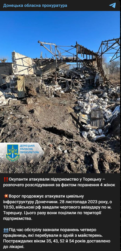 "Во время обстрела четверо работниц, которые находились в одной из мастерских, получили ранения. Пострадавших в возрасте 35, 43, 52 и 54 лет доставили в больницу", - говорится в сообщении.