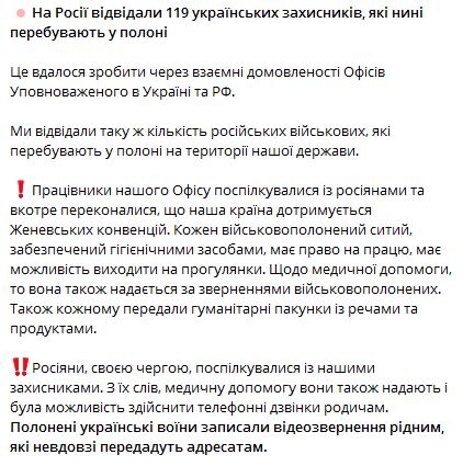 В четверг, 30 ноября, омбудсмены Украины и РФ одновременно посетили по 119 пленных военнослужащих двух стран.
