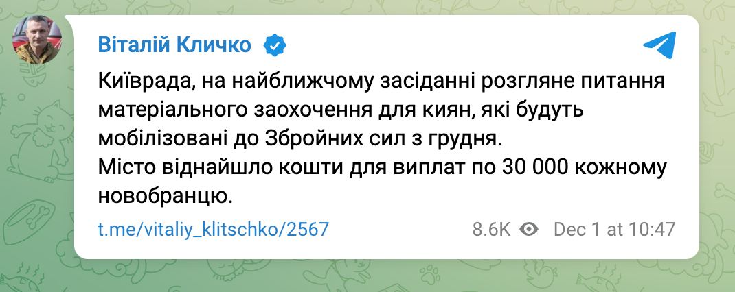 11.00 В Киеве, по примеру Одессы, могут ввести выплату за мобилизацию - 30 тыс. гривен.