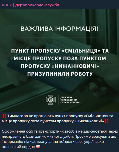 "Оформление лиц и транспортных средств не производится из-за неисправности базы данных таможенной службы. Просим учесть эту информацию при планировании поездок через украинско-польскую границу" - говорится в сообщении.