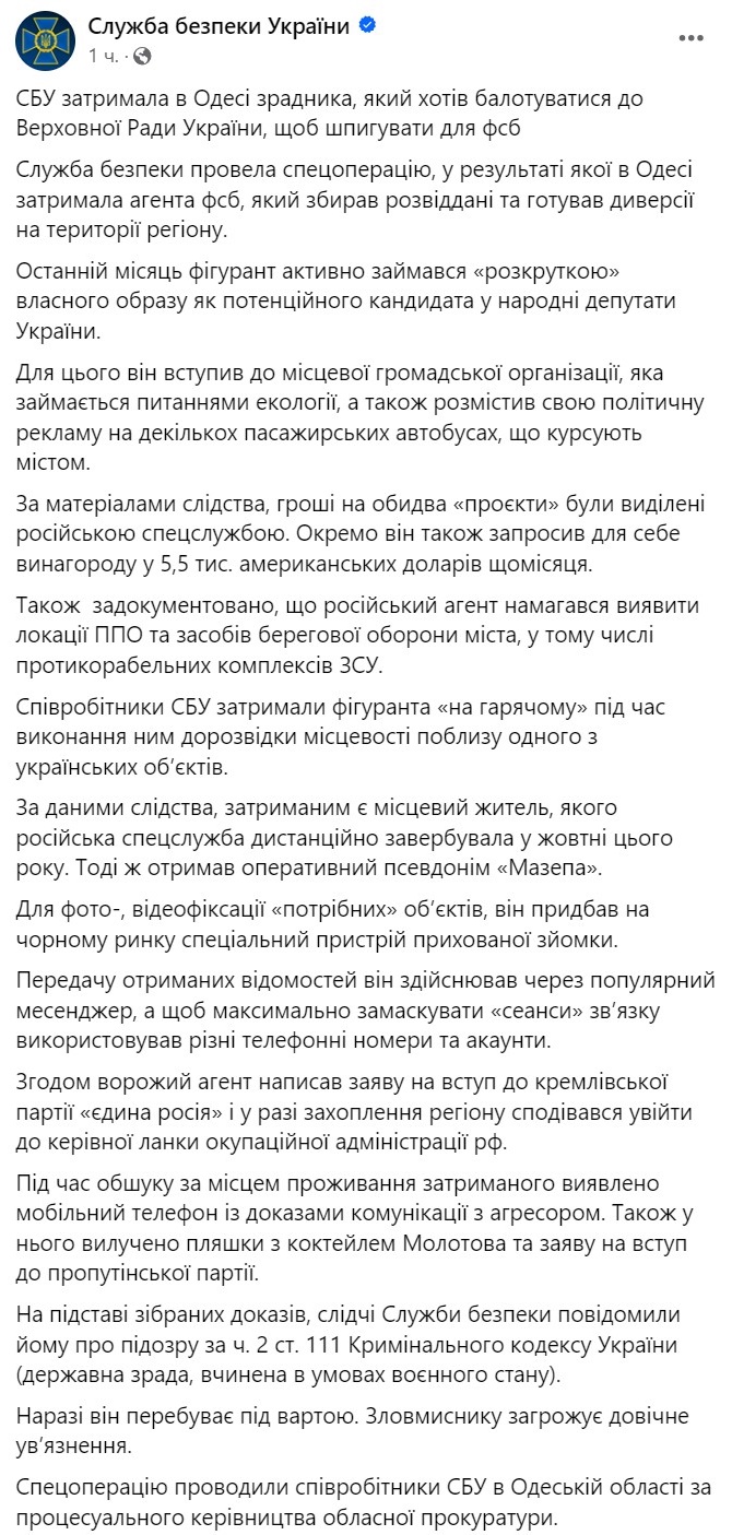 В Одессе задержали российского агента, который хотел баллотироваться в Раду, чтобы шпионить для ФСБ - СБУ