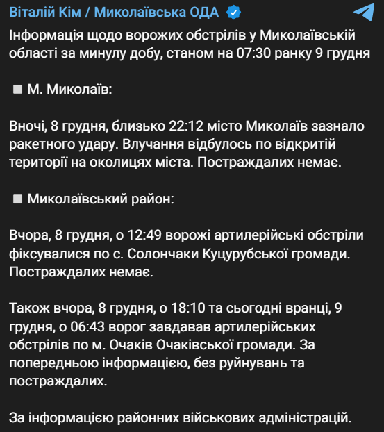 "Ночью, 8 декабря, около 22:12 город Николаев понес ракетный удар. Попадание произошло по открытой территории в окрестностях города", - написал он.