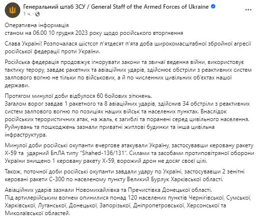 Утром 10 декабря Генштаб ВСУ обнародовал сводку о ситуации на фронте.