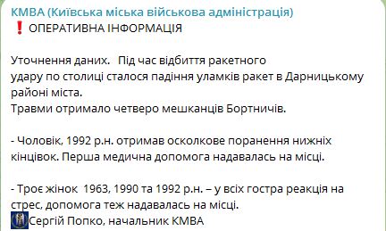 08.00 Во время отражения ракетного удара по Киеву произошло падение обломков ракет в Дарницком районе города. Травмы получили четверо жителей Бортничей.