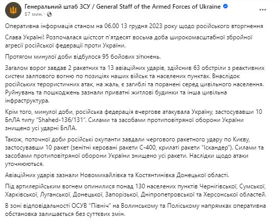 Утром 13 декабря Генштаб ВСУ обнародовал своду о ситуации на фронте за минувшие сутки.