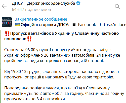 "По состоянию на 06:00 в пункте пропуска "Ужгород" на выезд из Украины оформлено 28 грузовых автомобилей. 24 из них уже прошли все виды контроля на словацкой стороне. С 19:30 13 декабря словацкая сторона частично восстановила пропускные операции в направлении въезда на свою территорию. Предварительно сообщалось, что на въезд в Словакию будут принимать по два автомобиля в час. Фактически в час пропускают по 3-4 грузовика", - говорится в сообщении.