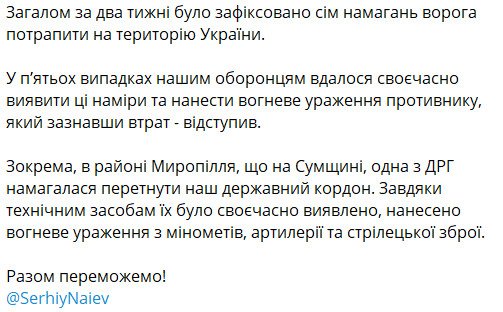 Ранее Сергей Наев говорил, что российские ДРГ по 9-10 раз в месяц пытаются проникнуть в Украину через границу с Черниговской и Сумской областями.