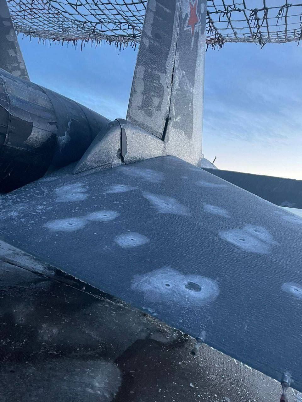 Между тем украинские паблики пишут, что в результате налета дронов российская техника получила "существенные повреждения". Детали повреждений не приводится. На опубликованных кадрах видны следы попадания осколков на самолете и обломок дрона.