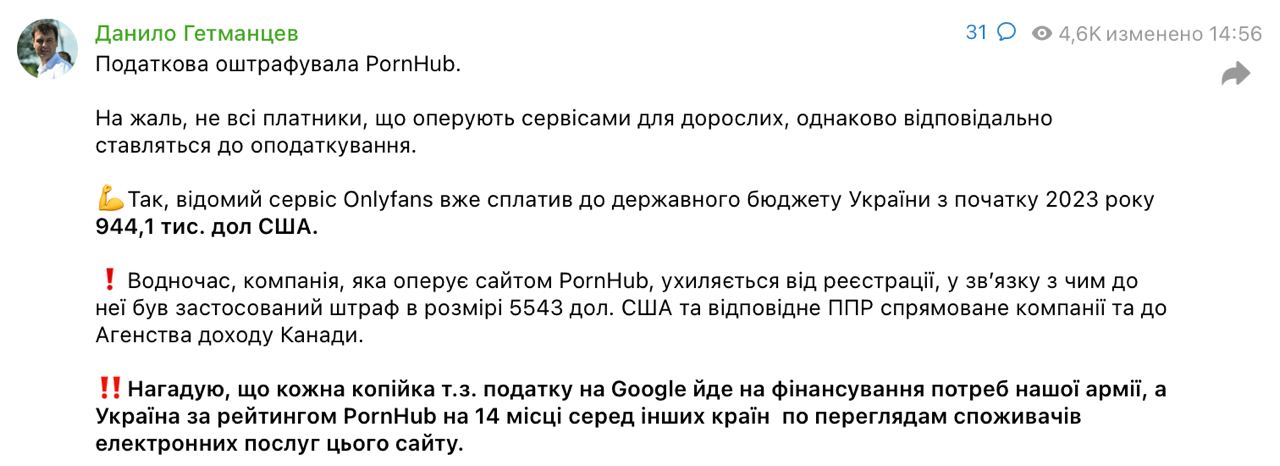 Тем временем, по словам Гетманцева, эротический онлайн-сервис OnlyFans уплатил в госбюджет с начала 2023 года почти миллион долларов.