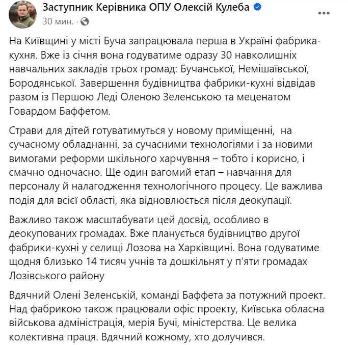 Об этом сообщает заместитель главы Офиса президента Украины Алексей Кулеба, который посетил завершение строительства фабрики-кухни вместе с Первой Леди Еленой Зеленской и меценатом Говардом Баффетом.