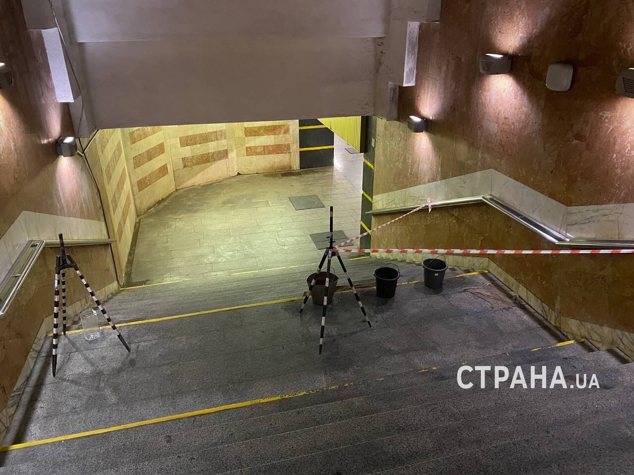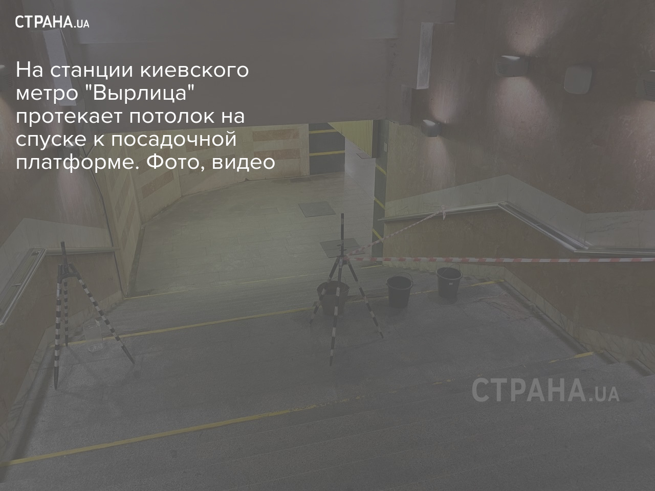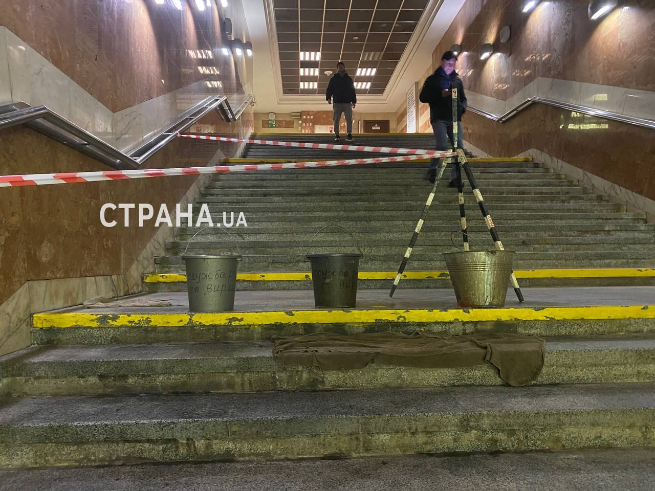 На станции метро "Вырлица" Сырецко-Печерской линии Киевского метрополитена протекает потолок на спуске к посадочной платформе.