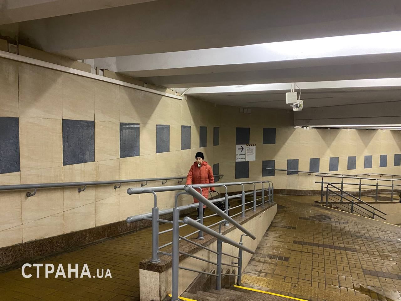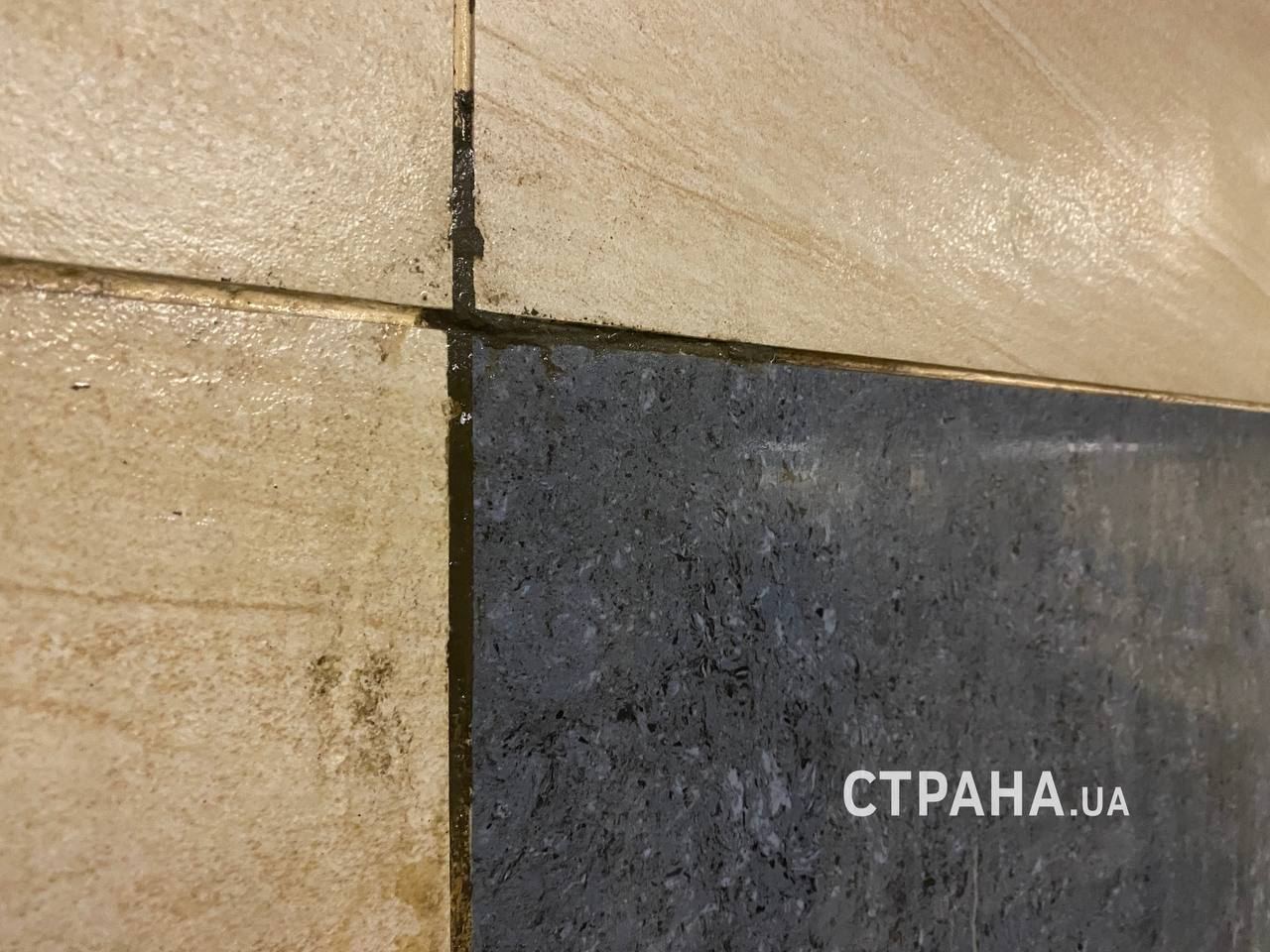 Также сотрудники "Страны" посетили станцию метро "Голосеевская" на закрытой части синей ветки. Вчера в киевских пабликах массово разошлось видео, как из стены между плитками там течет вода. Сегодня дыры, откуда сочилась вода, замазаны цементом, но на фото можно увидеть, что влага уже опять начала просачиваться: по стенам текут мелкие ручейки воды. На потолке отваливается штукатурка.