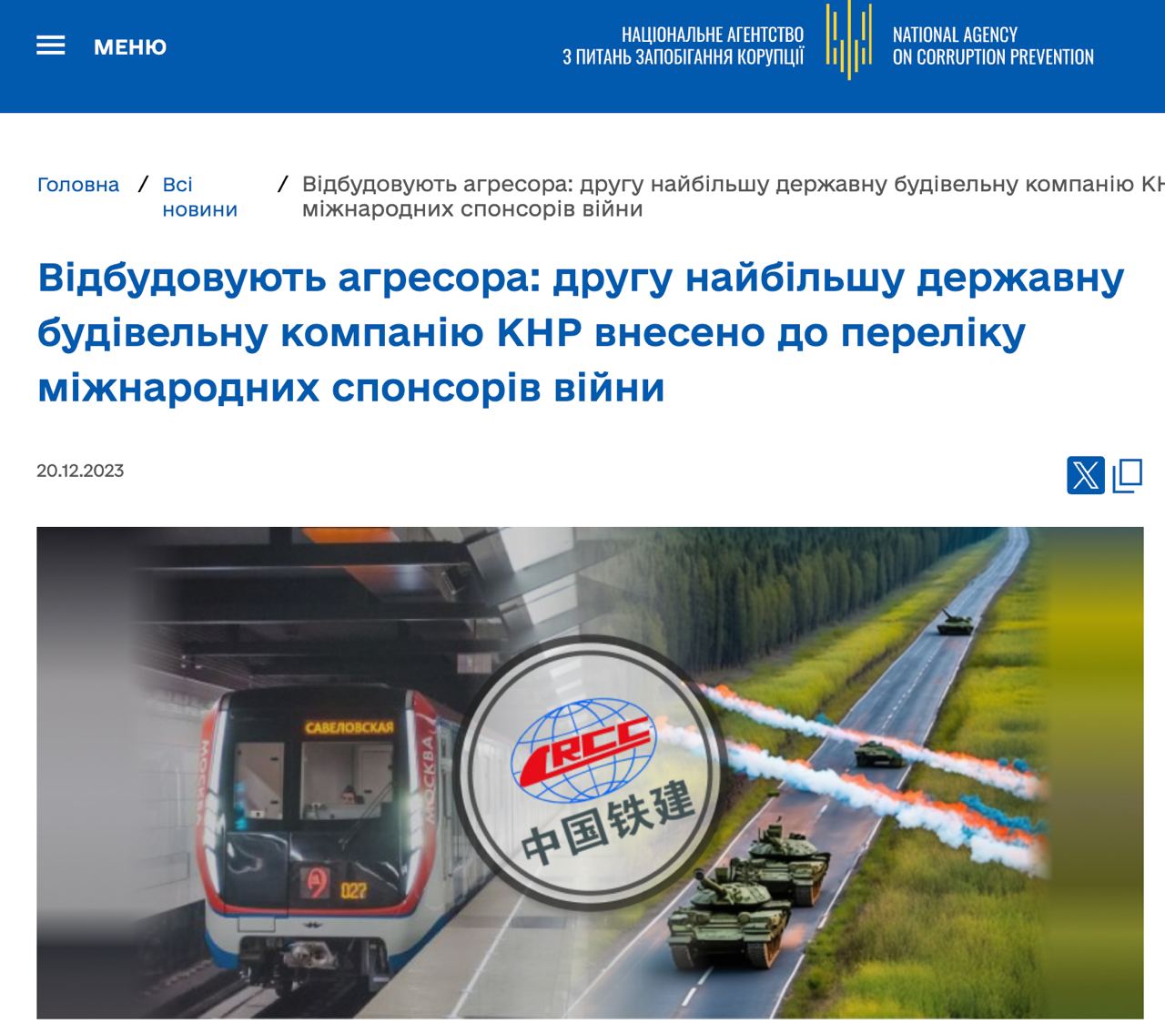 Национальное агентство по предотвращению коррупции (НАПК) внесло вторую крупнейшую строительную государственную компанию Китая China Railway Construction Corporation (CRCC) в перечень международных спонсоров войны.