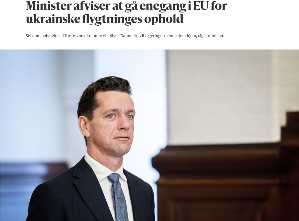 Как отметил министр, Дания рассматривает пребывание украинских беженцев в стране как временное, несмотря на то, что украинцы "культурно ближе к нам, чем люди с Ближнего Востока".