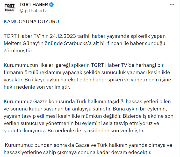 "В новостном выпуске телеканала TGRT Haber от 24.12.2023 ведущая Мельтем Гюнай, представляя новости, держала перед собой чашку, принадлежащую компании Starbucks. В соответствии с принципами нашей организации, строго запрещено выступать в качестве ведущего на TGRT Haber таким образом, чтобы скрыто рекламировать какую-либо компанию. Ведущая и режиссер, нарушившие этот принцип, были уволены", - заявили также на телеканале.