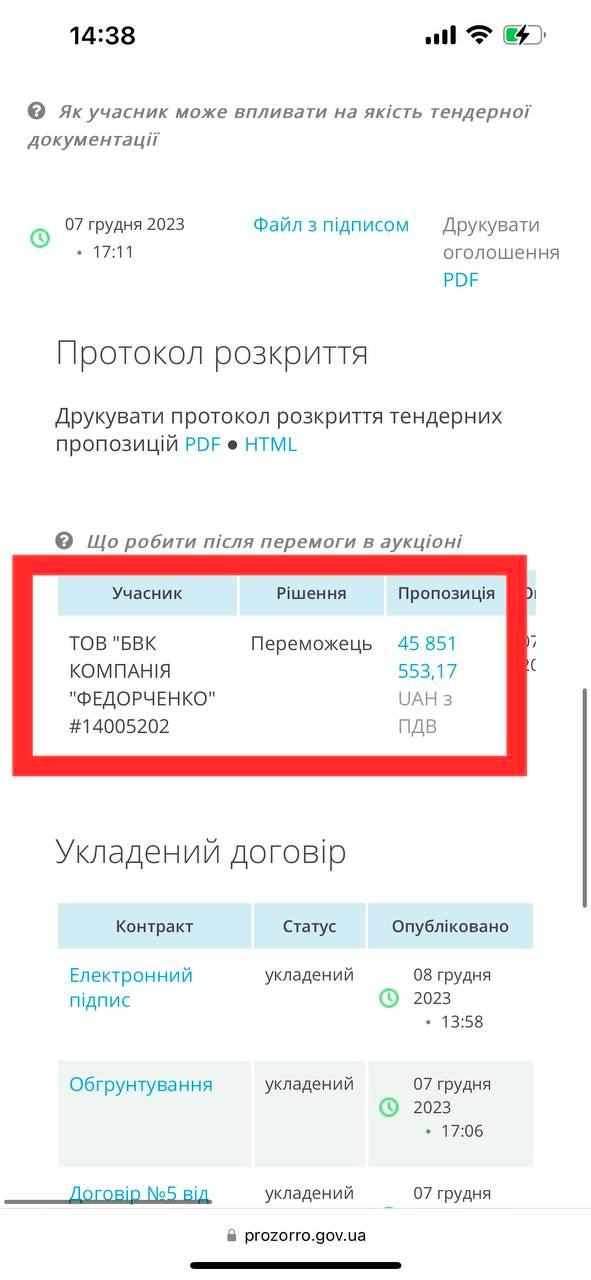 Стоимость работ, указанная в системе Prozorro, составляет 45 851 553,17 гривен. С упомянутой компанией 7 декабря 2023 года уже заключен договор. Срок окончания работ – 25 декабря.