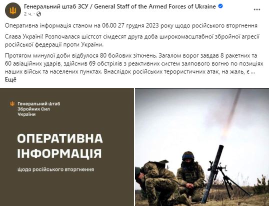 Война в Украине идет уже 672-й день. Мы следим за последними новостями и ключевыми событиями 27 декабря 2023 года в обновляемом онлайне.