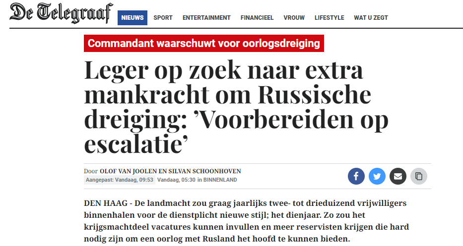 Главнокомандующий армии Нидерландов Мартин Вайнен заявил, что страна и общество должны готовиться к войне с Россией.