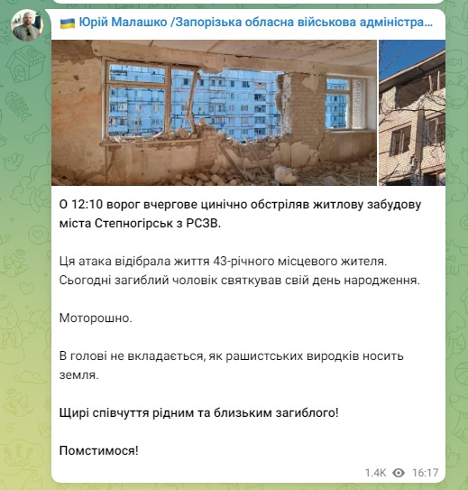 А в прифронтовом Степногорске Запорожской области от обстрела на свой день рождения погиб 43-летний мужчина, рассказал начальник областной военной администрации Юрий Малашко. По жилым кварталам ударили из РСЗО.
