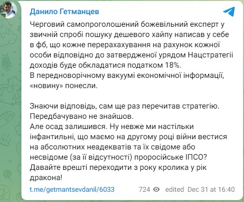 "Очередной самопровозглашенный безумный эксперт в привычной попытке поиска дешевого хайпа написал у себя в Фейсбуке, что каждое перечисление на счет каждого лица в соответствии с утвержденной правительством Нацстратегией доходов будет облагаться налогом в 18%. В предновогоднем вакууме экономической информации "новость" понесли. Зная ответ, он еще раз перечитал стратегию. Предсказуемо не нашел", - сказано в посте депутата.