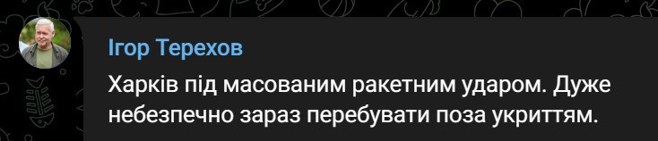 07.47 Харьков под массированным ракетным ударом, сообщил мэр Терехов.
