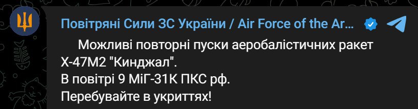 07.40 Воздушные силы сообщают о возможном пуске "кинжалов" на Киев.