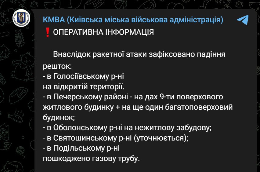 08.10 Военная администрация Киева подтверждает, что в Печерском районе два прилета по многоэтажкам - "на крышу 9-ти этажного жилого дома + на еще один многоэтажный дом".