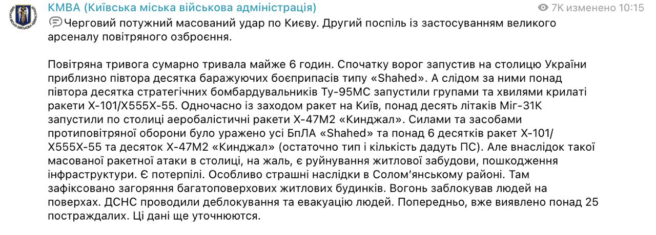 08.07 Еще несколько "Кинжалов" запущены по Киеву, сообщают Воздушные силы.