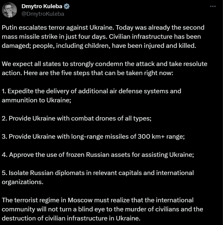 1. Прокомментировал сегодняшнюю российскую ракетную атаку по Украине. Сообщил о 5 поибших и 130 раненых.