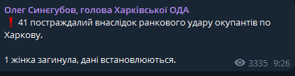 Глава Харьковской ОВА сообщил, что уже 41 пострадавший от ракетного удара, погибла женщина.