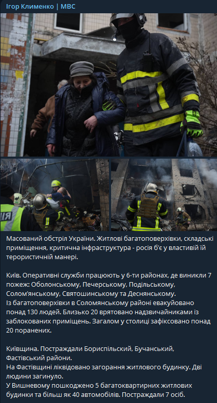 "На Фастовщине ликвидировано возгорание жилого дома. Два человека погибли. В Вишневом повреждены 5 многоквартирных жилых домов и более 40 автомобилей. Пострадали 7 человек", - добавил глава МВД.