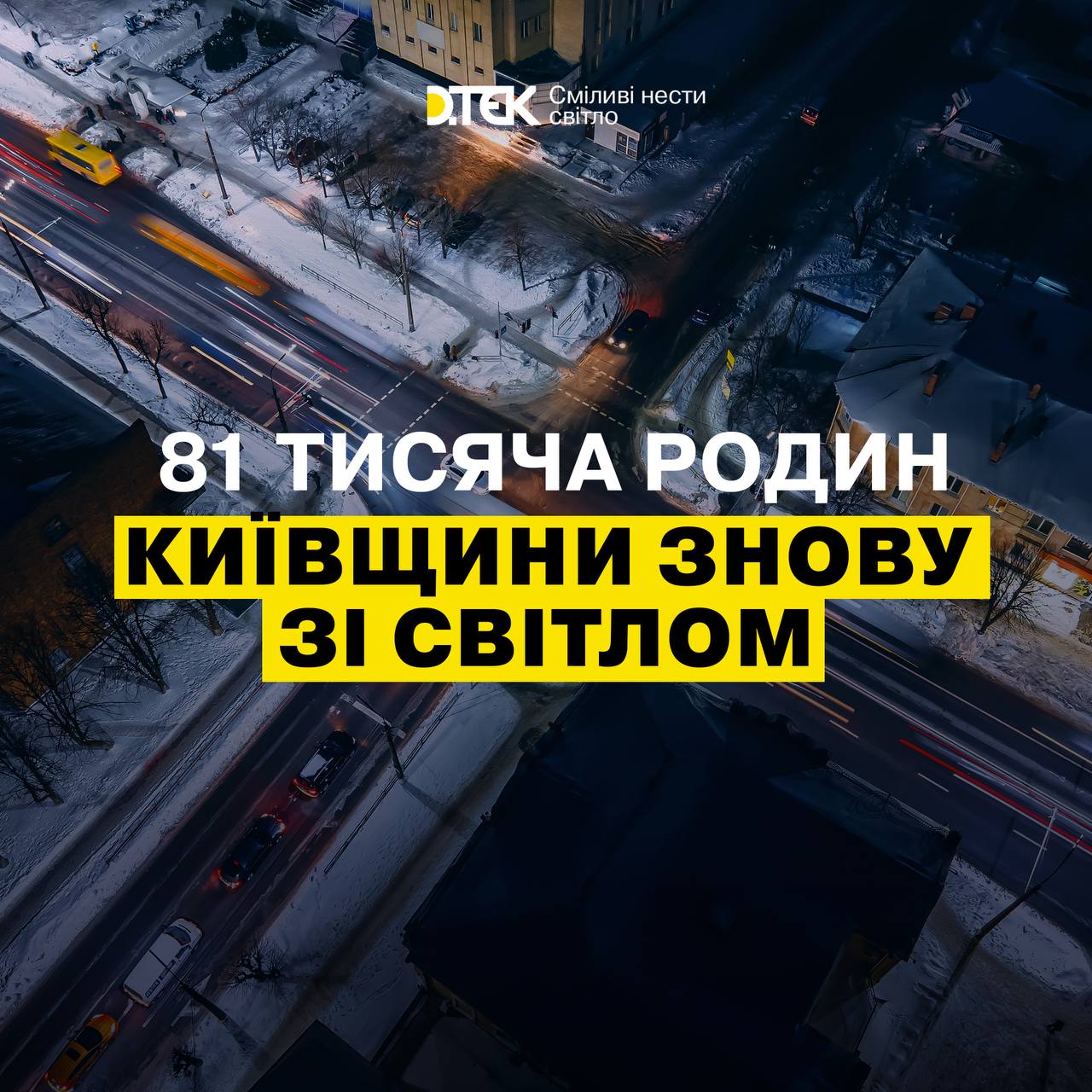 "Энергетики ДТЭК возобновили электроснабжение для 81 тысяч семей в Бучанском, Вышгородском и Фастовском районах. Работаем дальше, чтобы вернуть свет всем жителям Киевской области",  - говорится в сообщении.